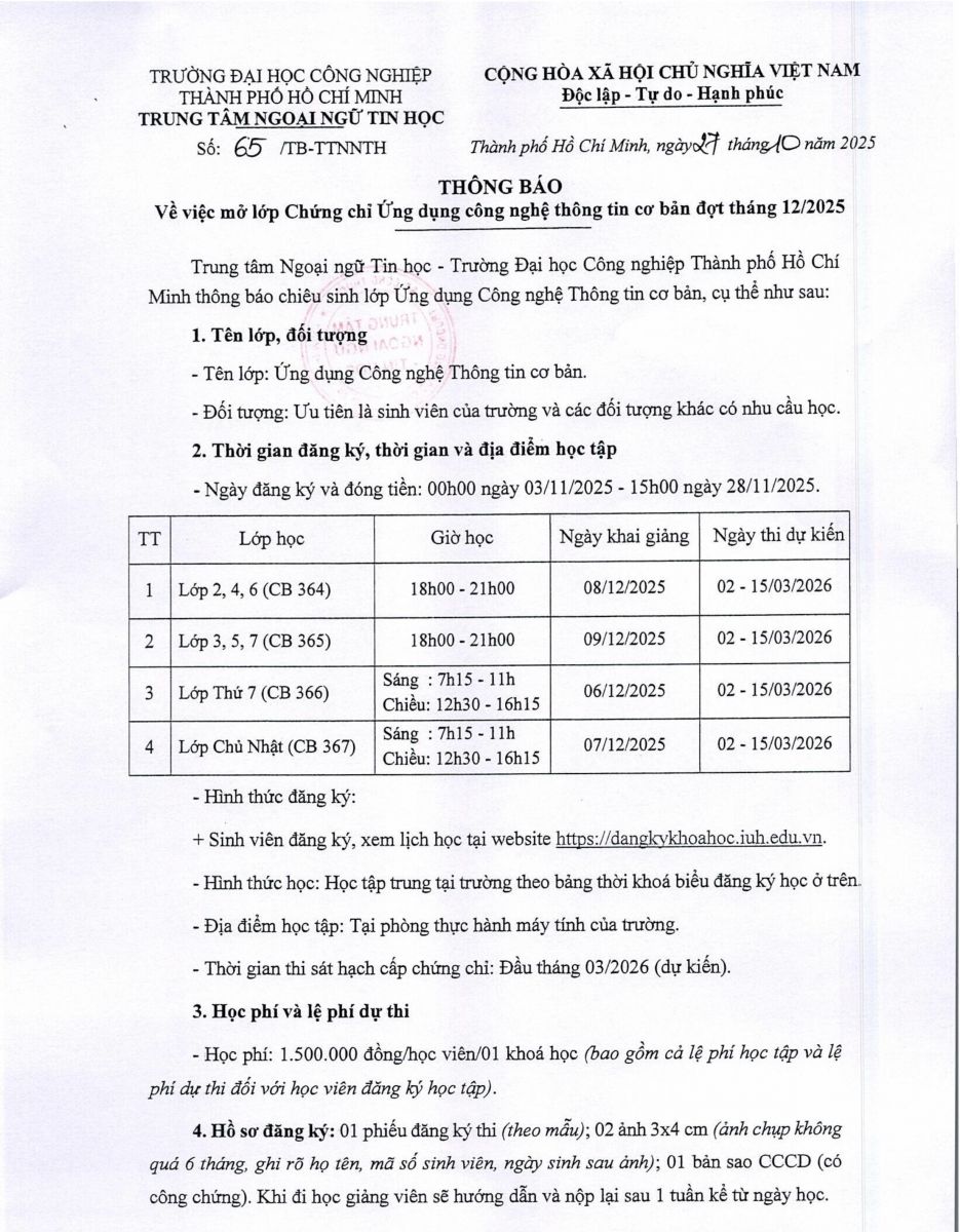 THÔNG BÁO V/V HẬU KIỂM CHỨNG CHỈ TIN HỌC (từ 01/11/2025)