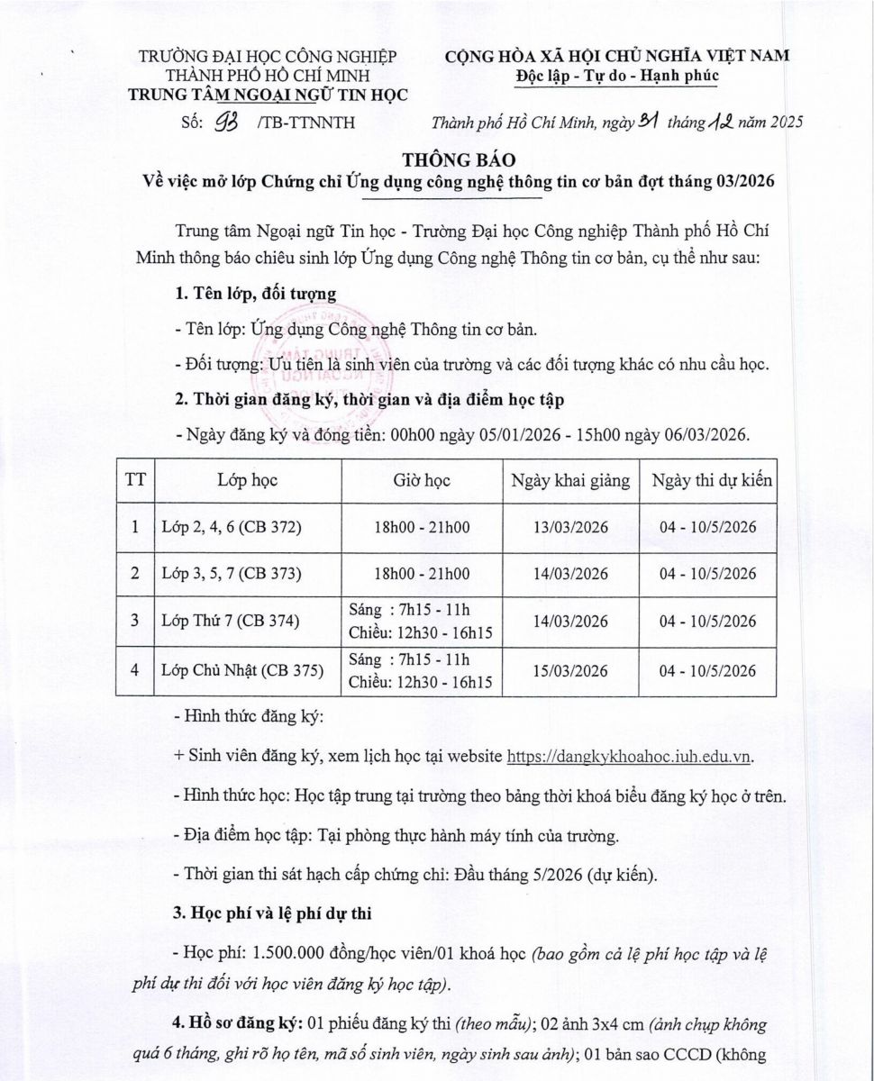 THÔNG BÁO CHIÊU SINH THÁNG 03/2026