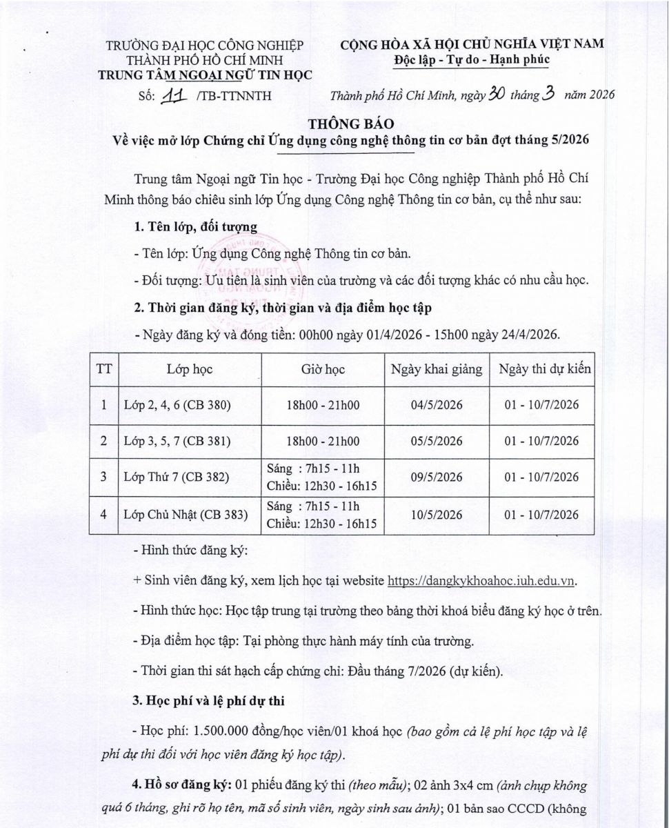 THÔNG BÁO CHIÊU SINH THÁNG 5/2026